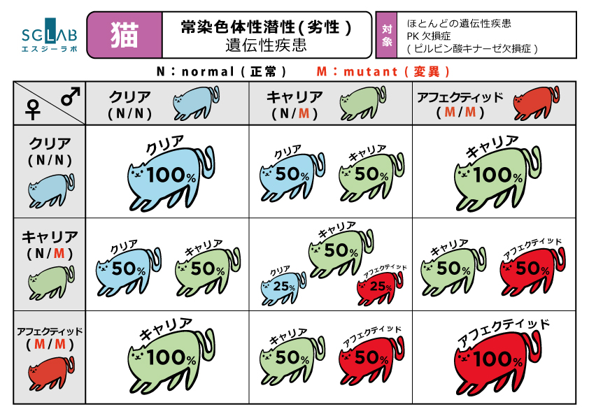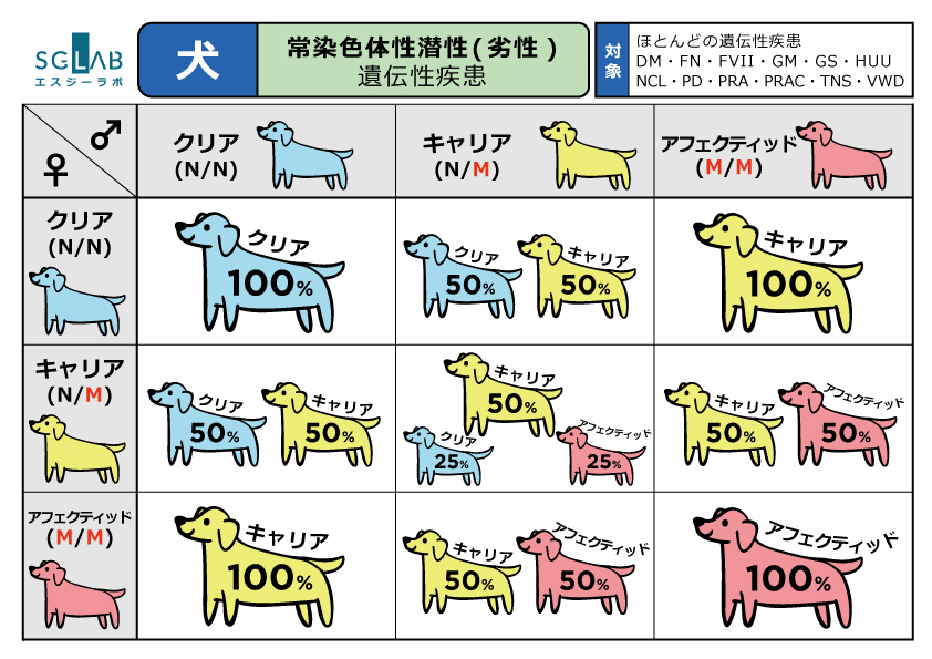 通常は発症しませんが、繁殖の際に同じ変異を持つ相手と交配すると、子に疾患が発症する可能性があります。